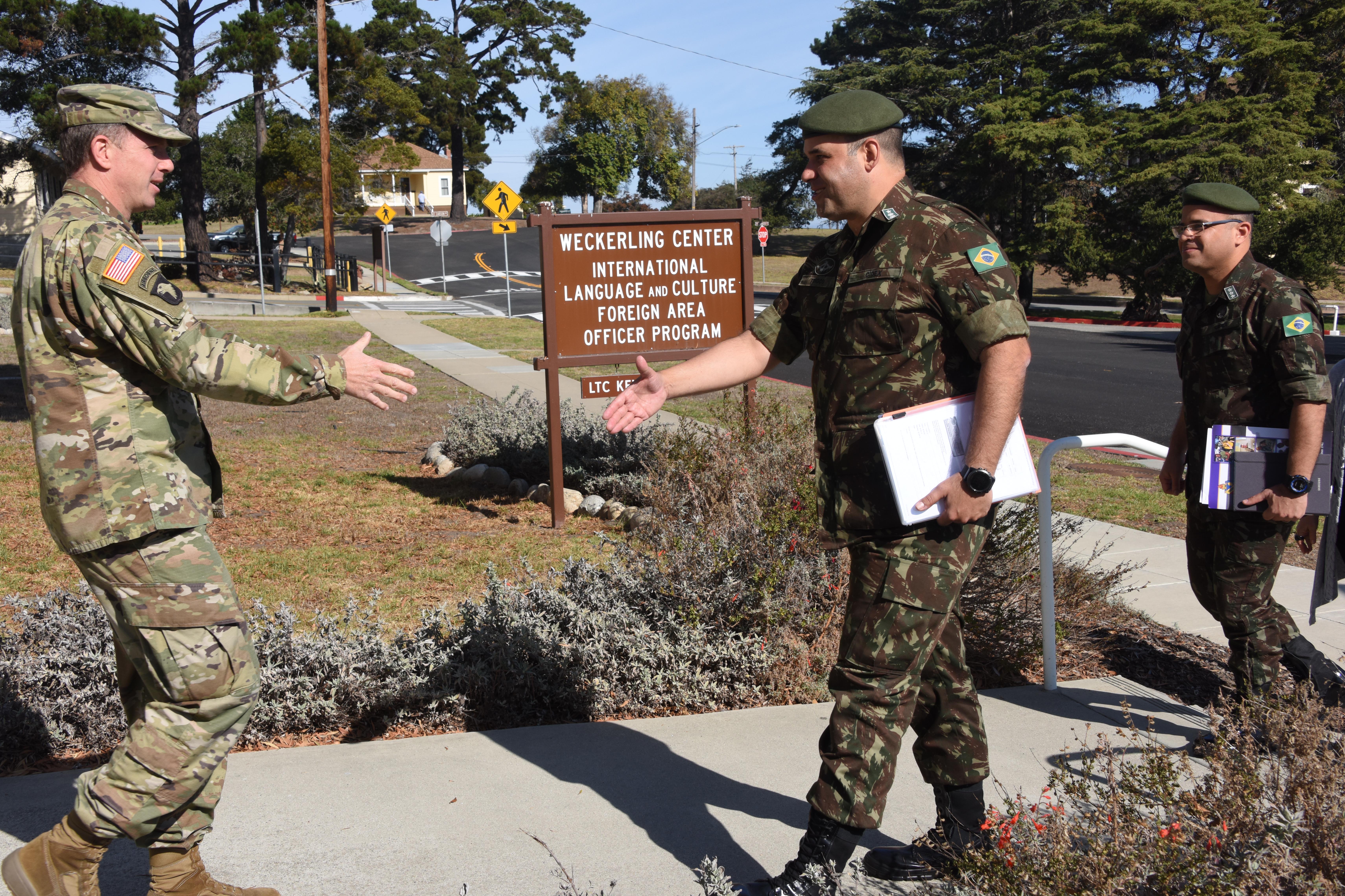 (L->R) Lt. Col. Kevin Bosch, director of the DLIFLC Foreign Area Officer Program, shakes the hand of Lt. Col. Sergio Avelar Tinoco, commander of the Brazilian Army Language Center, welcoming him and Capt. Carlos Henrique Souza Vilas Boas, head of the English...