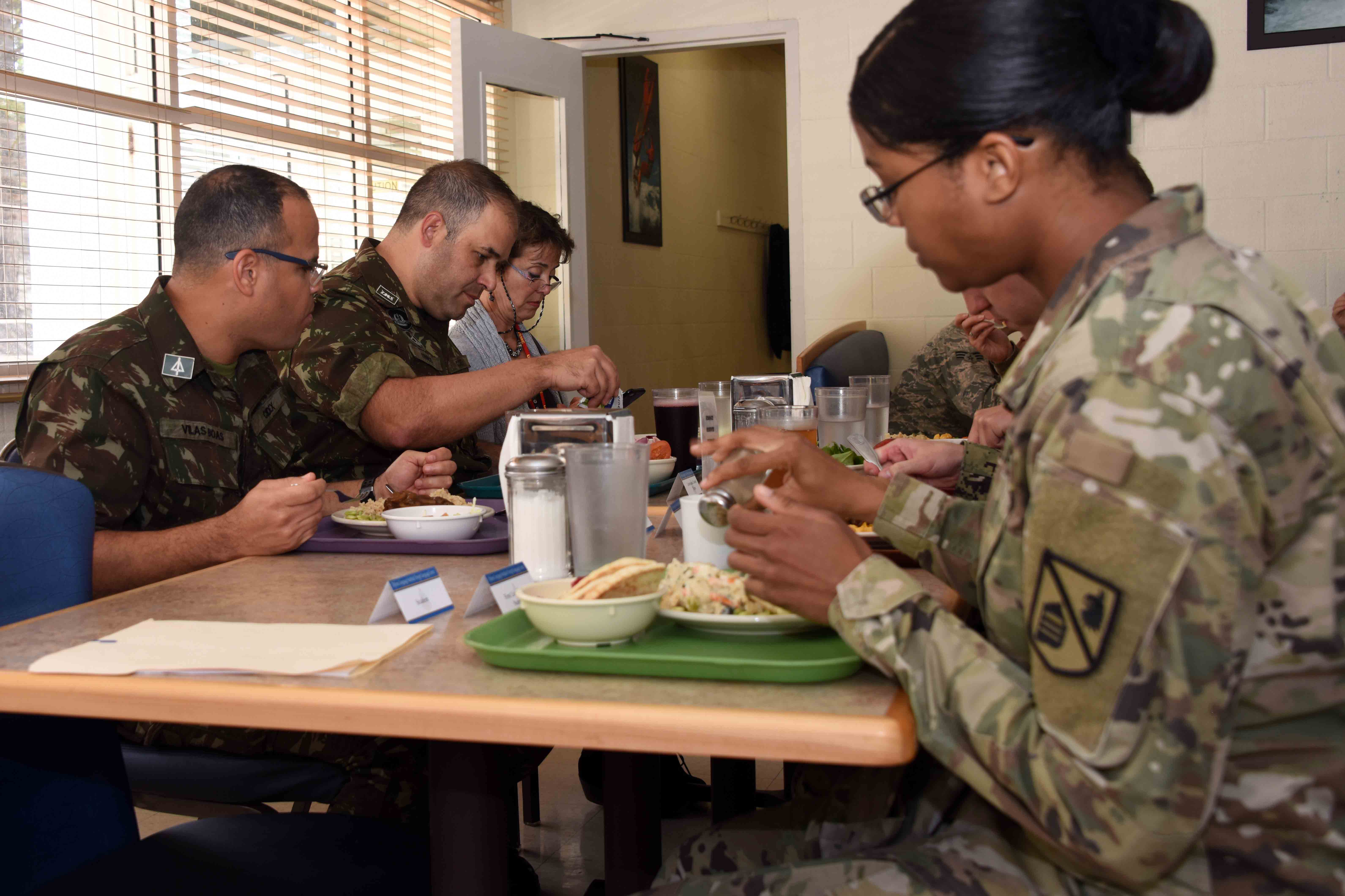Lt. Col. Sergio Avelar Tinoco and Capt. Carlos Henrique Souza Vilas Boas enjoy lunch with students and staff at Belas dinning facility at the Predidio of Monterey. (Photo by Natela...