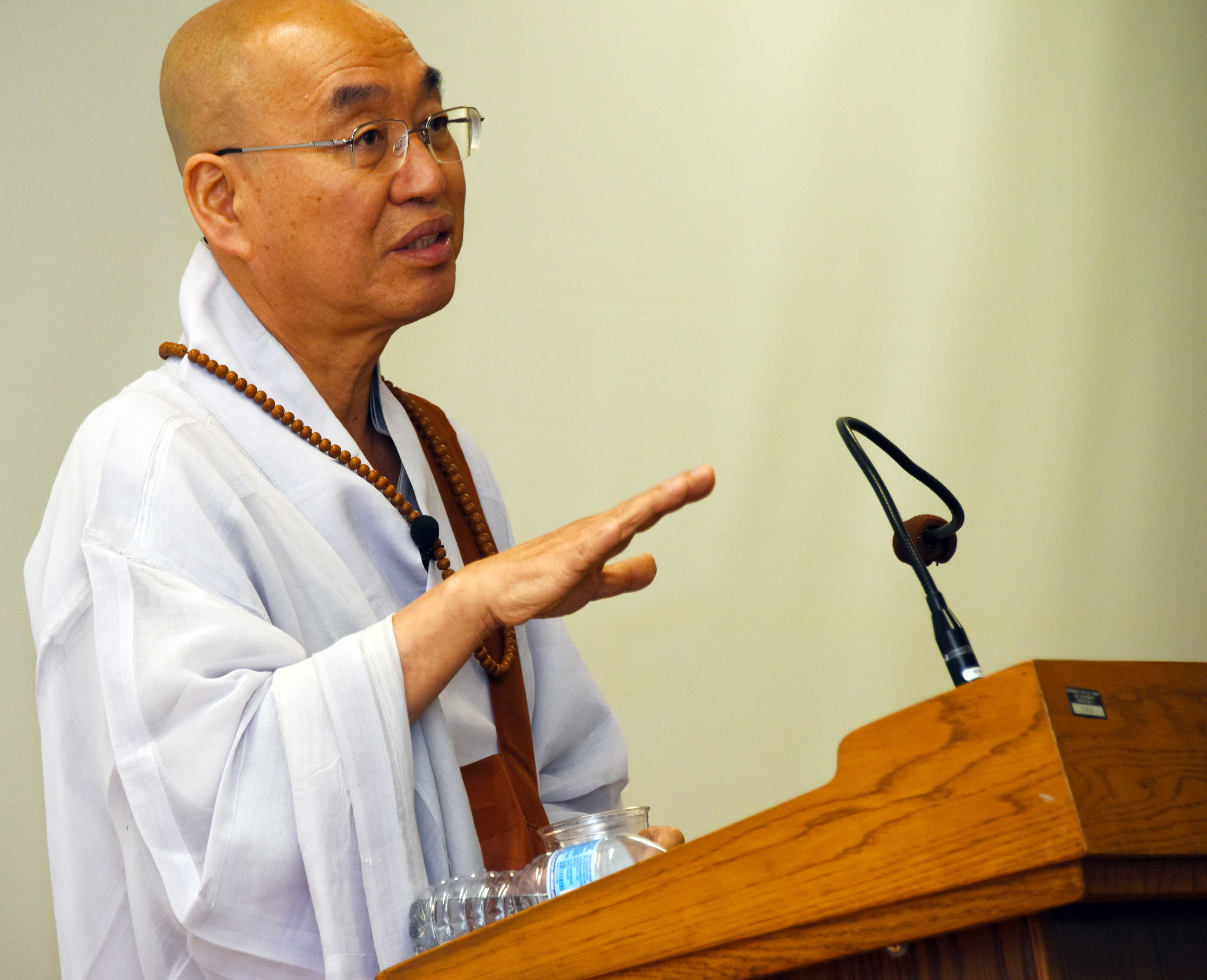 The Venerable Pomnyun Sunim speaks from the podium at the Korean language school at DLIFLC Sept. 25. (Photo by Natela...