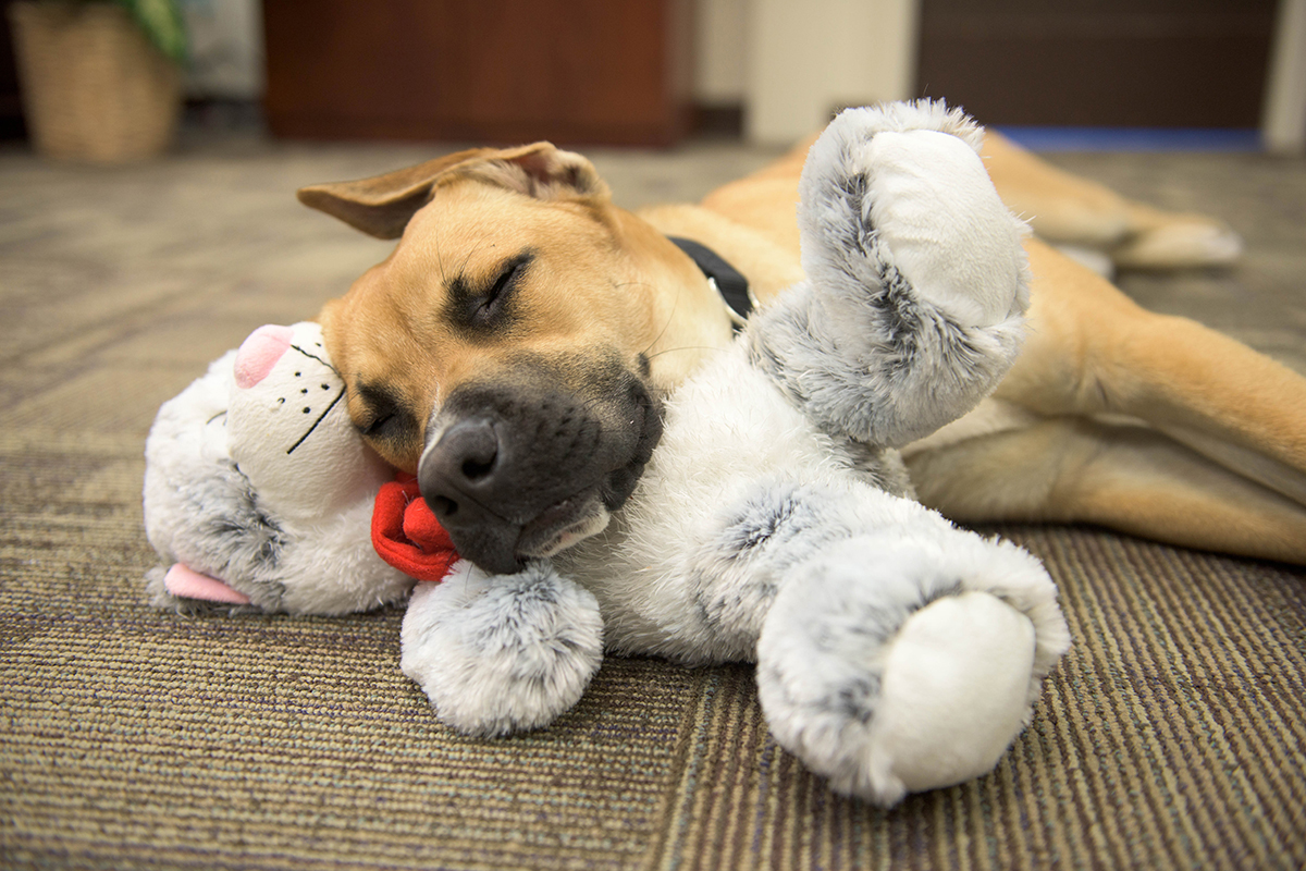 PFC Lingo asleep on the job with his favorite stuffed kitty.